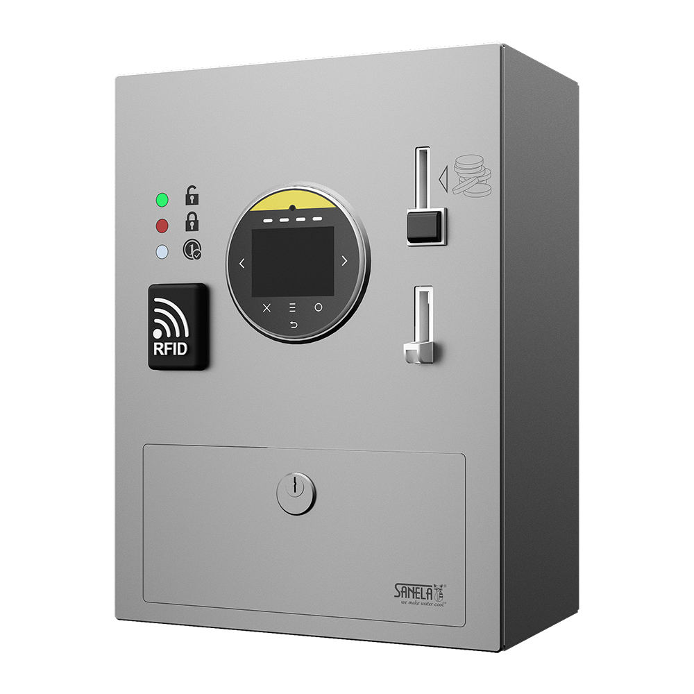 SLZA 43S - nr. wyr. 88434 - nierdzewny automat płatniczy z elektroniką, modułem Bluetooth, wrzutnik, pojemnik na monety, czytnik kart płatniczych, czujnik płatności RFID, komplet kluczyków (2 szt.), SW sprcha